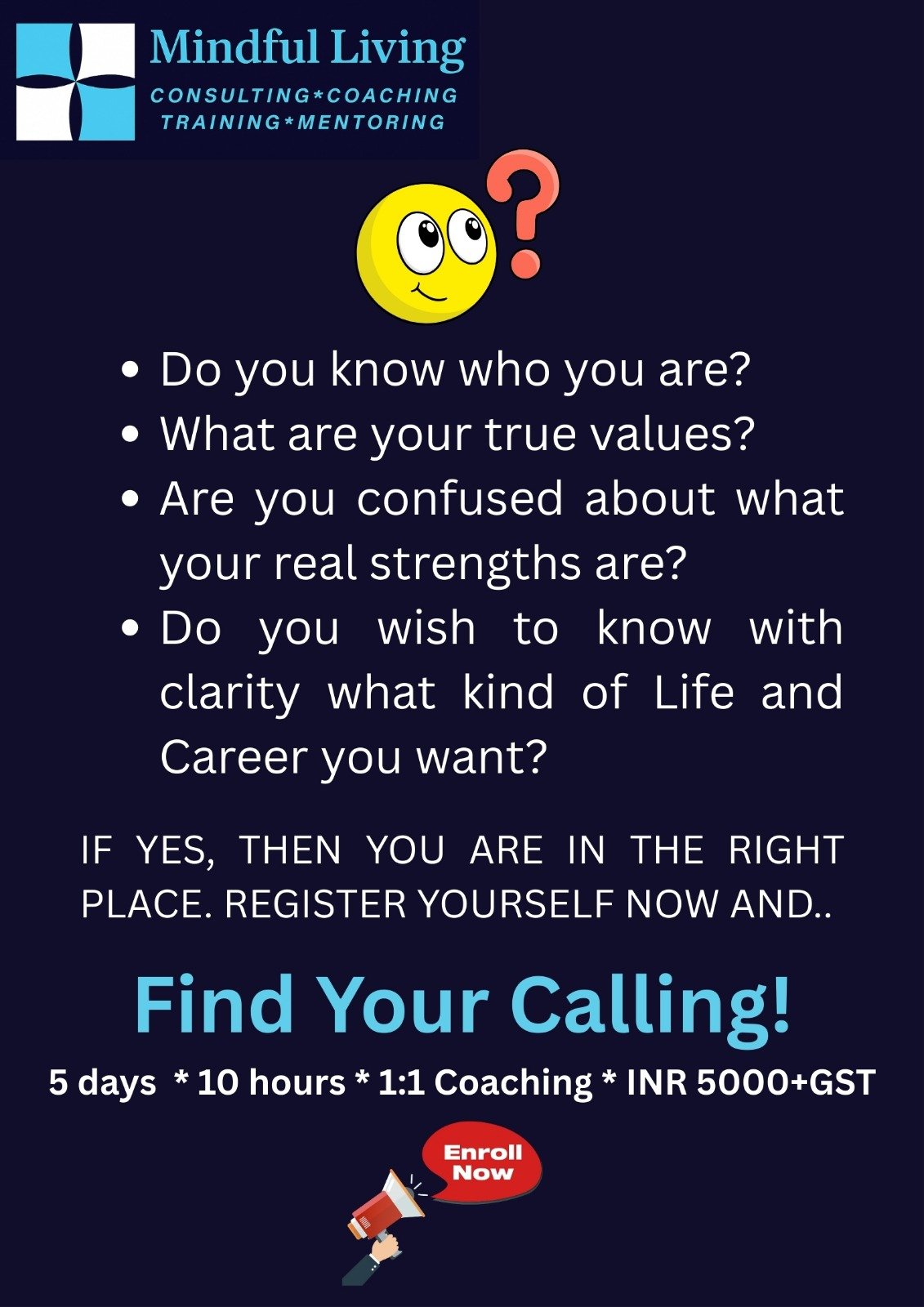 At Mindful Living (OPC) Private Limited (MLPL), we guide corporate, educational institutions and individuals to lead with self-awareness, resilience, and purpose. Our offerings are rooted in neuroscience, human psychology, emotional intelligence, spiritual wisdom, and the extensive professional experiences of our founder and core team members. We believe that when you live and lead mindfully, you unlock your highest potential.